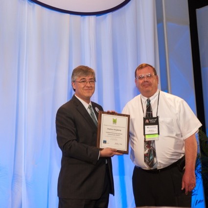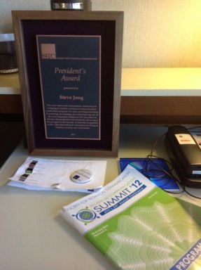 When I finished my prepared remarks I started to leave the stage. But I noticed the TelePrompTer scroll up “Steve ad lib,” which wasn’t in the rehearsal script… Then STC President Hillary Hart, who had been standing to one side during the presentation, unexpectedly called me back to the podium. When she started to describe the President’s Award, I realized she was talking about me.