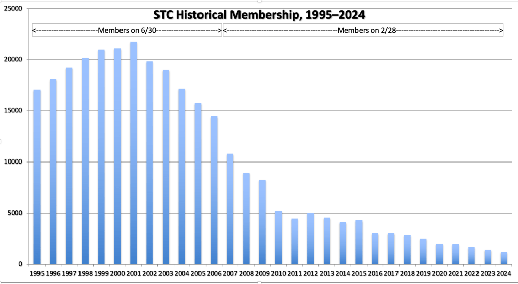Note: This data is discontinuous. Before 2007, it was the membership at the end of the STC fiscal year on 30 June. From 2007 on, as the decline reached 50%, STC, perhaps understandably, stopped disclosing its membership to members. From then on, I used the membership data announced yearly by the STC election teller on 28 February. I believe the apparent membership drop you see for 2007 is an artifact of that change, but the data on either side is comparable.